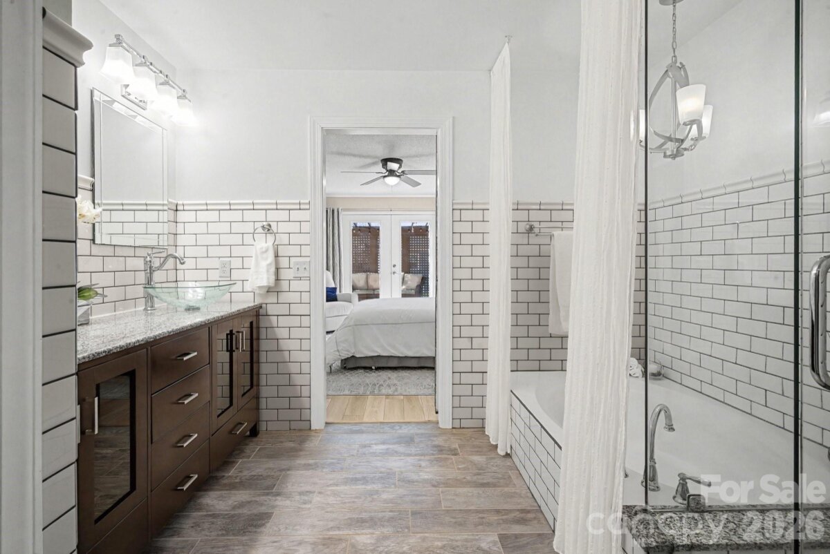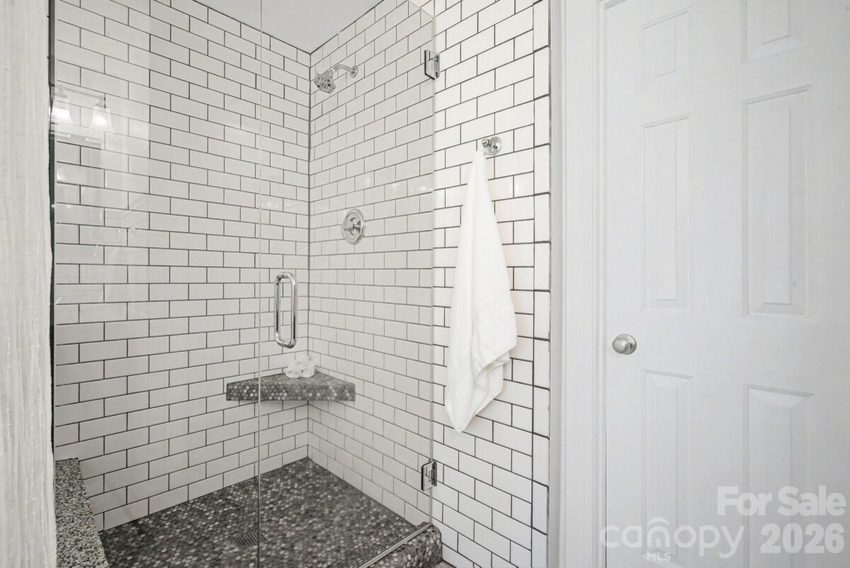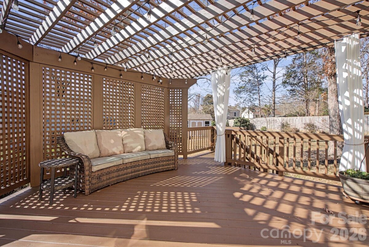 Absolutely immaculate and meticulously renovated home nestled on a prime .36 cul-de-sac lot. Pride of ownership in full display, this home is in superior cosmetic and mechanical condition inside and out allowing the new buyer to sit back, relax, and enjoy all the improvements. Stunning curb appeal from the street highlighted by the desirable brick front exterior, attached two car garage, covered front porch, 2025 Architectural roof, 2025 vinyl insulated windows, 2025 landscape retaining wall, 2025 front door, 2022 HVAC, and over $15,000 of permanent landscaping additions over sellers’ tenure. Inside you will be greeted by the open two-story great room layout accented by new 2025 LVP floors, neutral paint, replaced ceiling fan, attractive wood burning fireplace, intricate trimwork, and exposed staircase/catwalk. The sunlit dining room showcases a beautiful bay window, elegant crown molding, and open views to the remodeled kitchen (sellers had non-load bearing wall between kitchen and dining removed to open up the floor plan). The elaborate 2024 kitchen renovation boasts new stylish two-toned kitchen cabinets, sleek quartz countertops, tile backsplash, and new stainless-steel dishwasher. The kitchen sliding glass door was replaced in 2025 and leads to the expansive deck and fenced backyard. After a long day, escape and unwind in the spa like primary bedroom retreat located on the main level featuring crown molding, barn door, remodeled bathroom with large garden tub, subway tile accents, shower stall, glass enclosure, dual vanities with vessel sinks, separate water closet, large walk in closet, and French doors leading to private pergola directly off bedroom. A convenient mudroom with laundry hookups and a half bathroom complete the first floor layout. The renovations continue on the second level as well with brand new 2025 carpet upstairs. The flexible loft space showcases large picture windows and new light fixture - great space for your personal needs (home office, playroom, den, etc). Two generously sized secondary bedrooms in perfect move in condition share a remodeled full bathroom with dual vanities and tile accents. The walk in attic space was partially finished with floors and drywall installed - providing valuable storage for the home. Extend your living area outside on the expanded 2018 deck with open eating area and covered pergola with market lights and curtains for additional privacy. The pristine deck leads to a 2020 custom brick paver patio overlooking the privacy fenced backyard. Storage shed conveys. Outside the fenced area you will find a dedicated sunny garden area with raised beds ready for your own spring/summer plantings and crop. Google Fiber available! The HOA is voluntary and covers the front entrance beautification. Prime Matthews location - minutes from shopping, restaurants, Downtown Matthews, and more!